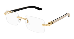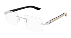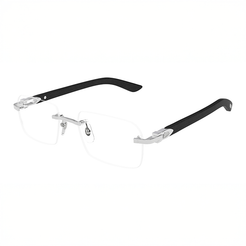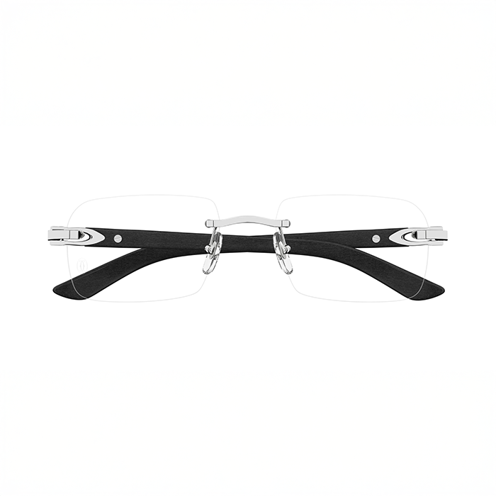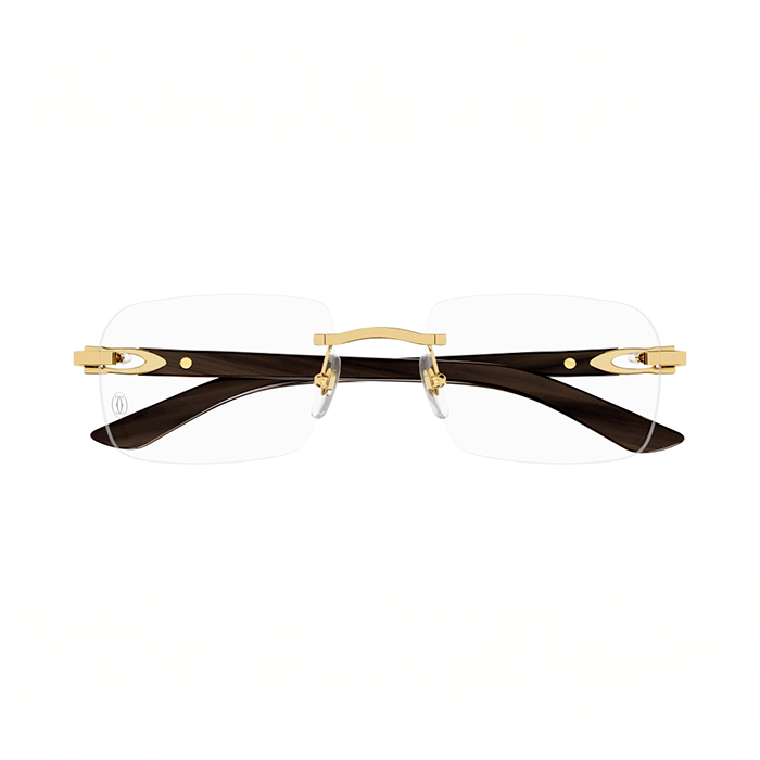 These modern, sophisticated frames with temples crafted in wood.  Sleek, rimless design for a contemporary look. The iconic C Décor detail embellishes the hinge with Cartier logo plaques on the temple tips as a tasteful signature.