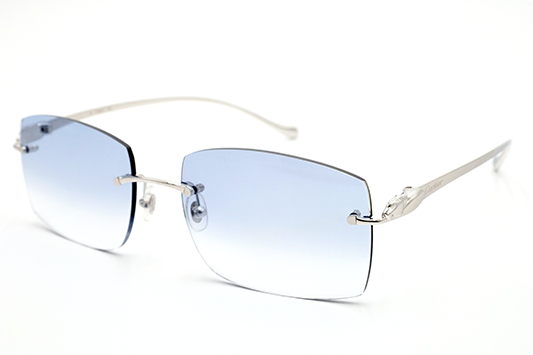 These platinum-plated rectangular sunglasses feature gray gradient lenses, dynamic sculptured Panthère head and shoulder on metal temples, fashioned as if it's stretching towards the hinge. Incredibly elegant with adjustable nose pads for comfort.