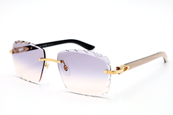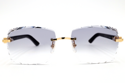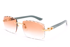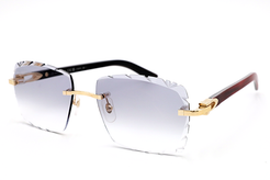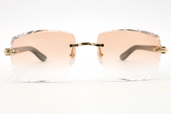 These modern, sophisticated frames with temples crafted in teal wood or red buffalo horn with a rimless design for a contemporary look. The iconic C Décor detail embellishes the hinge with Cartier logo plaques on the temple tips as an tasteful signature.