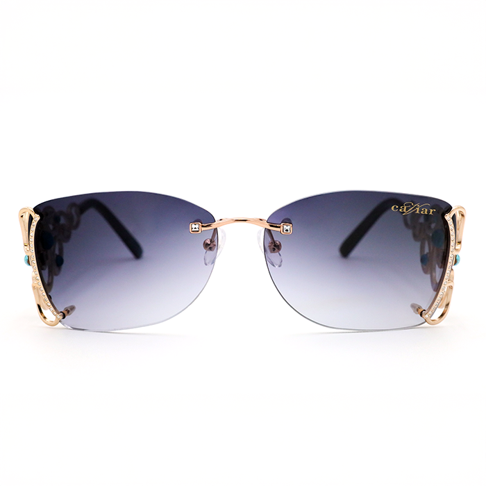A whimsical, rimless rectangle design with a slight upturn at the nose bridge. The eye-catching temples feature golden ovals and circles in an organic pattern, accented by turquoise crystals. True jewelry for the face.
