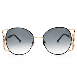An elegant, round frame in thin black metal. The simplistic front makes way to a spectacular gold netting design, embellished with Swarovski crystals. The golden temple with its keyhole design seamlessly connects to the netting with a cluster of larger crystals.
