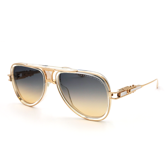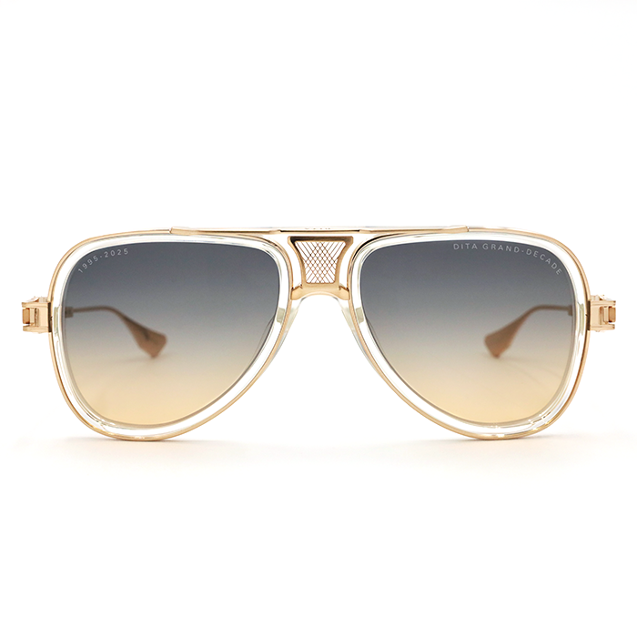 An a milestone piece that reflect DITA's 30-year commitment to eyewear excellence. A luxurious evolution of the classic aviator showcasing a intricate floating crown bridge crafted from fine mesh wire. Ornate and refined with sculpted titanium temples, elegant linework and enamel in lays.