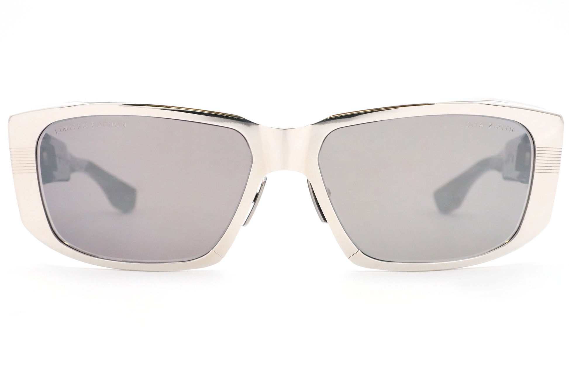 Fashionable futurism exudes from this revolutionary frame. The single-piece metallic chrome front is embellished with pressed line detailing that points the eye towards the dramatic cut-out on the temple.