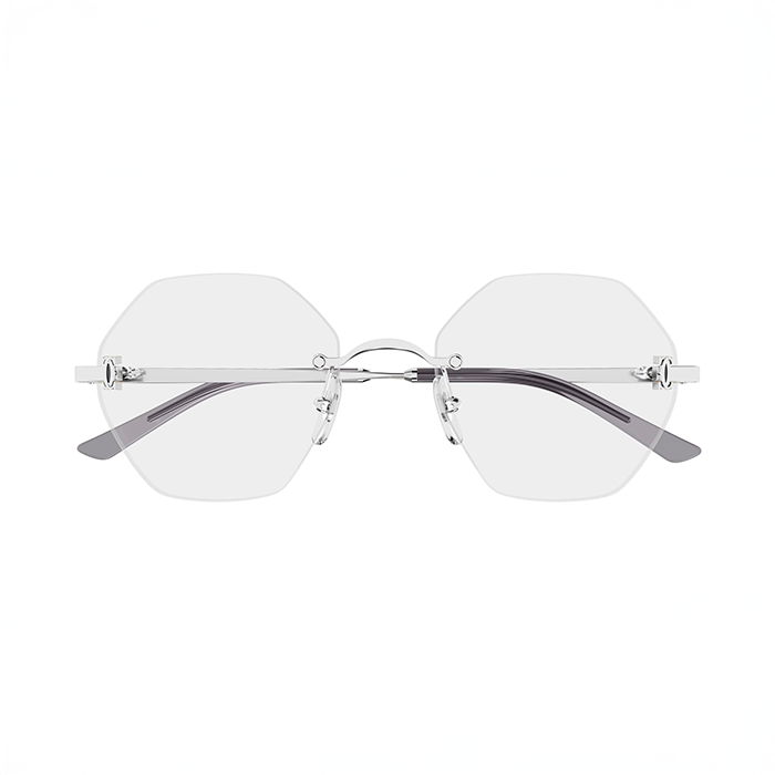 A light, ultramodern interpretation of the Double C in platinum-plated metal. The iconic, interlocking Double C Cartier logo embellishes the front of the frame, connecting to the hinge. Feminine and sophisticated.