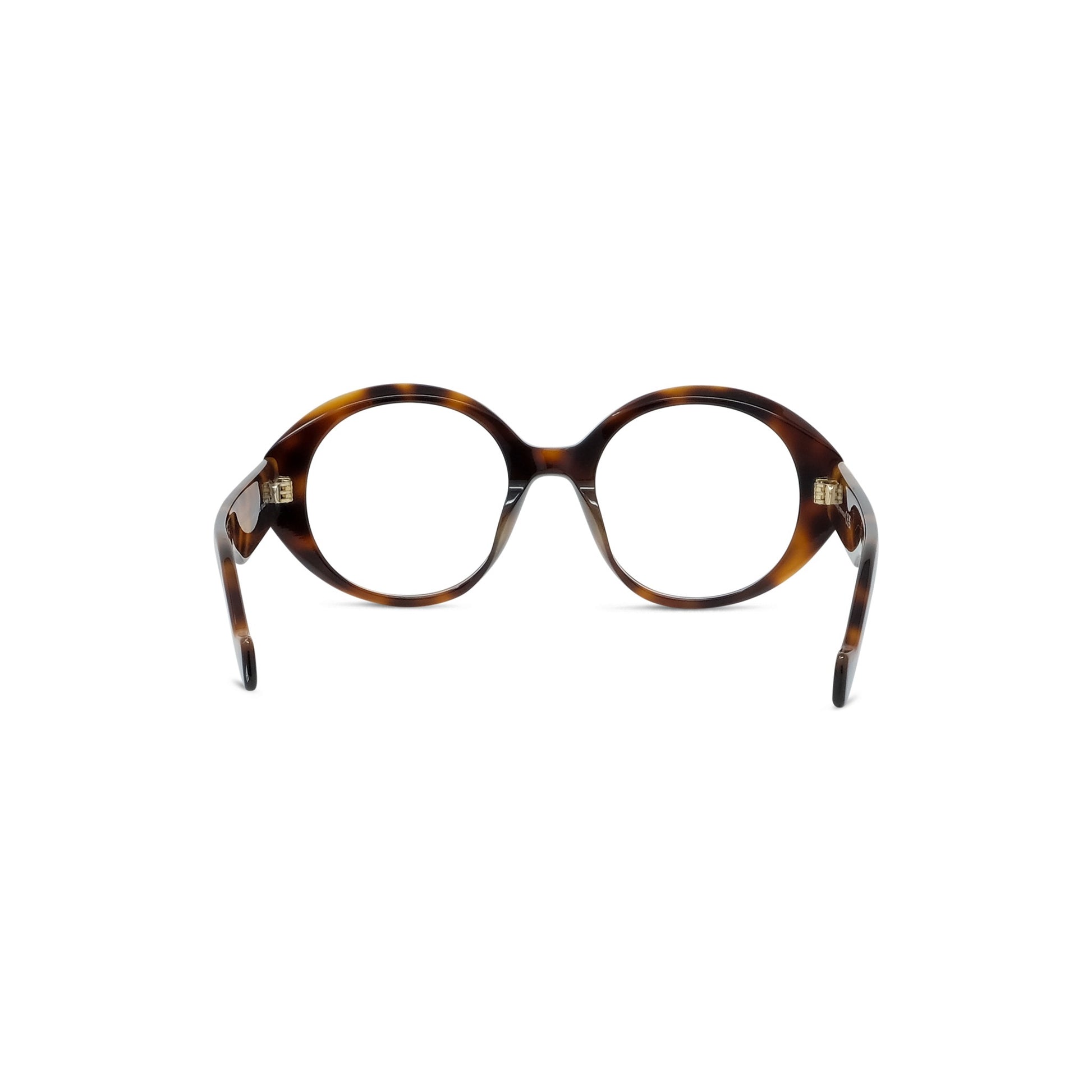 A charming, round frame in lightweight acetate. A golden Anagram adorns the unique temples that geometrically taper towards the rounded temple tips. More metal embellishments decorate the flat frame front, inspired by the sun Screen story.