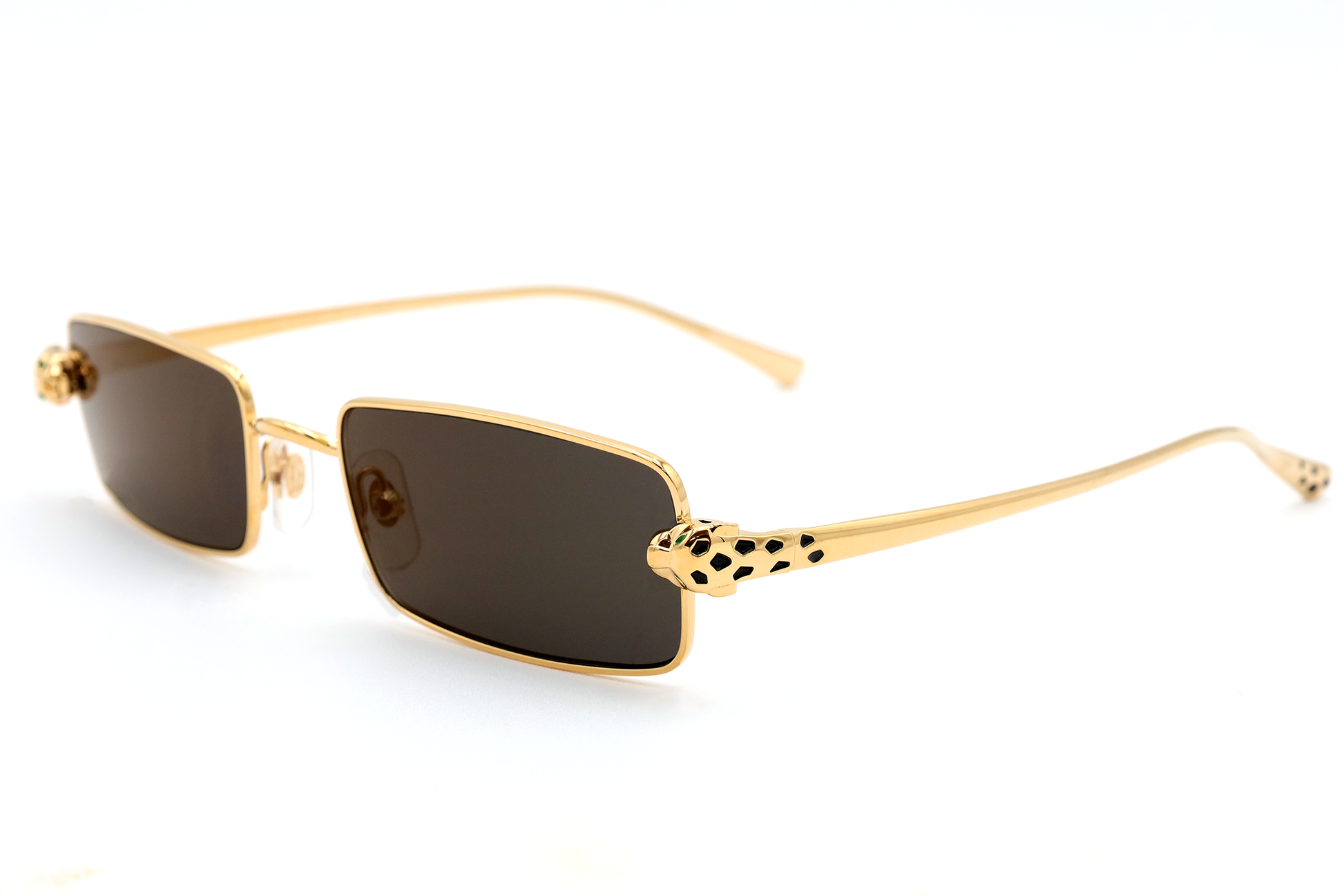 These 24k gold-plated or platinum-plated rectangular sunglasses feature three-dimensional Panthère Massai heads with hand-placed enamel spots and captivatingly bright green eyes taking a bite in to the side of the colored lenses. The enamel spots continue on to the temple tips, serving as the panther's tail.