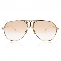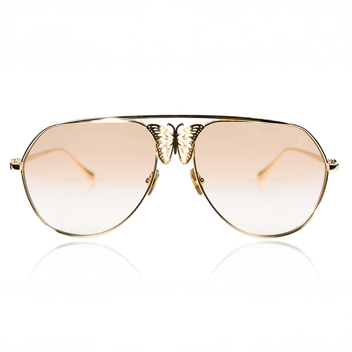 A highly feminine, aviator frame crafted from lightweight titanium. The unique nose bridge design features a precisely detailed butterfly caged by a thin brow line. Powerful yet whimsical.