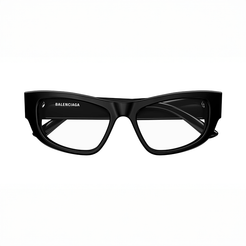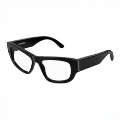 Simple, stylish eyeglasses that exude strength in bold rectangular shape. A contemporary feel with thick, acetate temples that curve into dramatically curled end-pieces. A subtle Balenciaga lettering logo decorates the beginning of the temple.