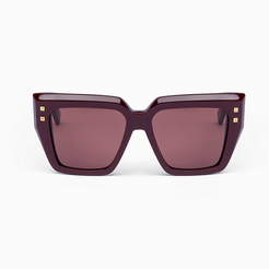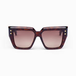 A bold, squared shape with a sharpened wing. Dramatic volumes create an elegant strength while gold accents provide captivating contrast. Thick temples taper in curved temple tips in this sleek acetate design.
