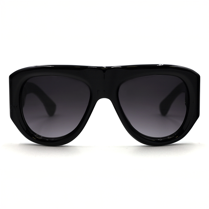Dramatic, 70s-inspired pilot frames in sleek acetate, handcrafted in Italy. Deep tear-drop lenses and 'Cantilever' wirecores emphasize the inherent expressiveness of the piece. JMM's signature spur rivets embellish the temples.