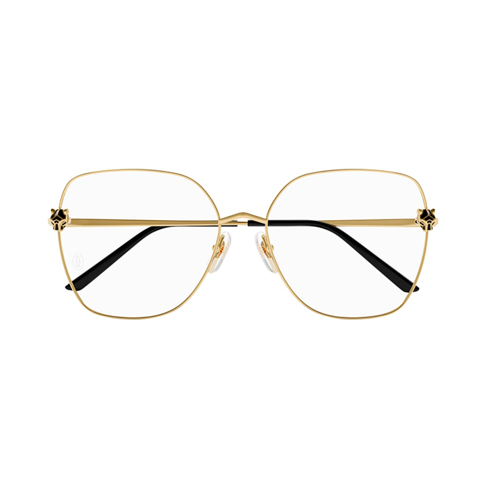 The new Panthère aesthetic showcasing the visionary three-dimensional Panthère head with enamel detailing and geometric design. A square-shaped frame in thin, elegant gold-plated metal complemented by black acetate temple tips.