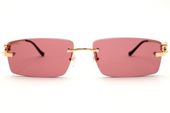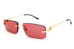 As one of the most iconic jewelry brands in the world, Cartier represents pure luxury. These 24k gold-plated rectangular sunglasses feature the signature "Cartier Red" tint, dynamic sculptured Panthère head and body on metal temples, acetate temple tips recalling the Panthère tail movement, and adjustable nose pads.