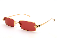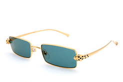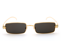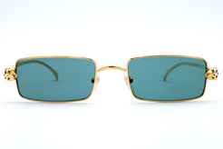 These 24k gold-plated or platinum-plated rectangular sunglasses feature three-dimensional Panthère Massai heads with hand-placed enamel spots and captivatingly bright green eyes taking a bite in to the side of the colored lenses. The enamel spots continue on to the temple tips, serving as the panther's tail.