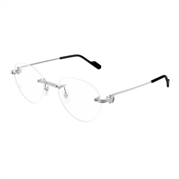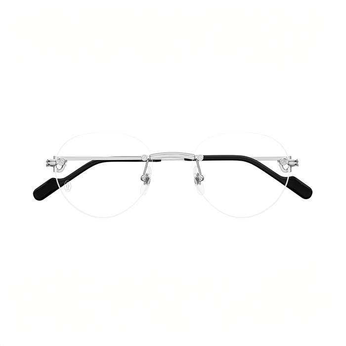A contemporary, rimless style with rounded lenses. The Première aesthetic with its Godron detailing decorates the hinge in this platinum-plated piece. Black acetate temple tips provide comfort and style while adorned with the Cartier logo.