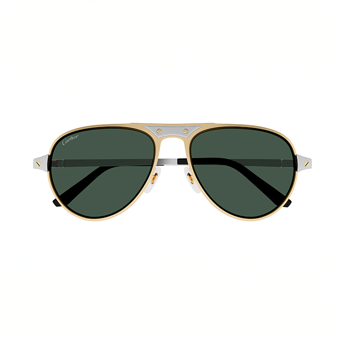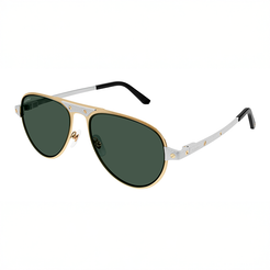 As one of the most iconic jewelry brands in the world, Cartier represents pure luxury. These bi-colored aviator sunglasses include yellow gold and platinum, enhancing the Santos screws on the front and temples. The classic full rim aviator shape is perfect for those wanting an elegant yet masculine piece. Acetate temple tips in black provide comfort and beautifully contrast the metals of the frame.