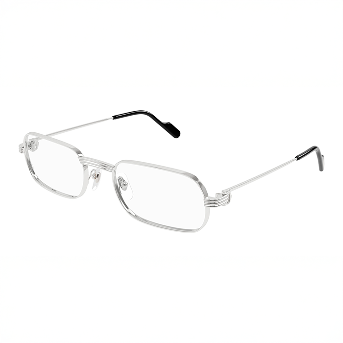 An elegant full rim construction of the Première light metallic aesthetic. Gleaming temples adorned with the C de Cartier and Godron detail, serving as both a style element and a functional choice on the hinge. Sleek, black acetate temple tips provide a comfortable fit.