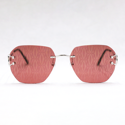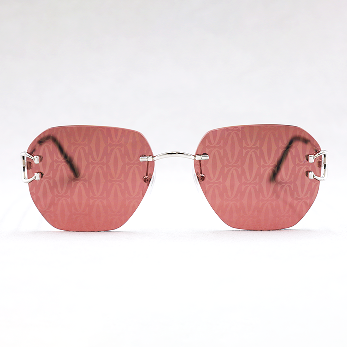 Rimless platinum-plated construction for a chic, contemporary look with squared lenses. The interlocking Cartier double C logo decorates the deep red lenses, perfectly contrasting the platinum frame. Sleek, black acetate temple tips provide comfort.