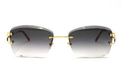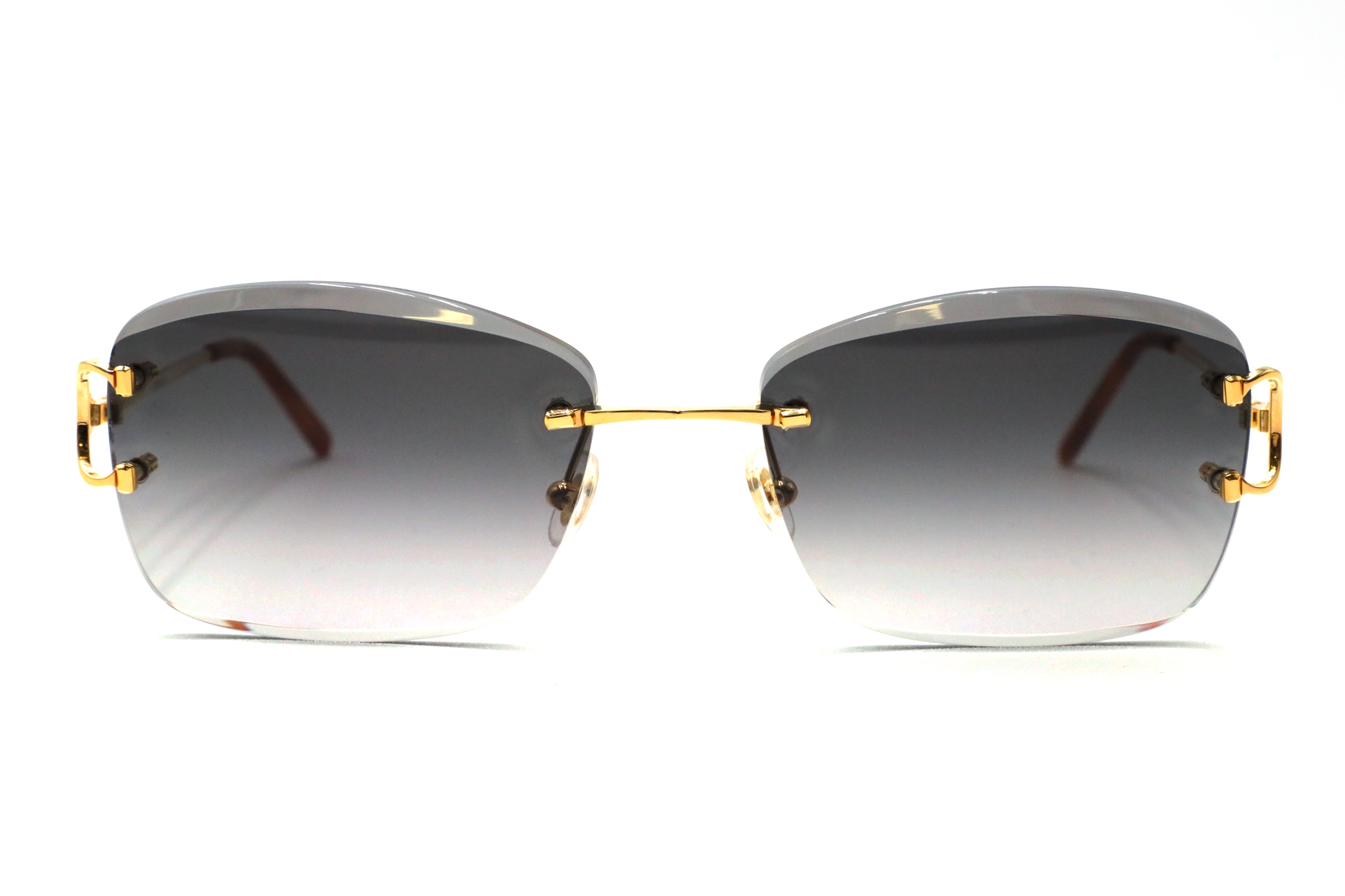 As one of the most iconic styles within the Cartier collection, this Signature C de Cartier custom style features luxurious gray gradient lenses with the "Double C" aesthetic. This 24k gold-plated style features the Cartier logo on the temples and burgundy temple tips, complemented by the iconic golden Cartier logo.