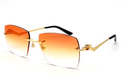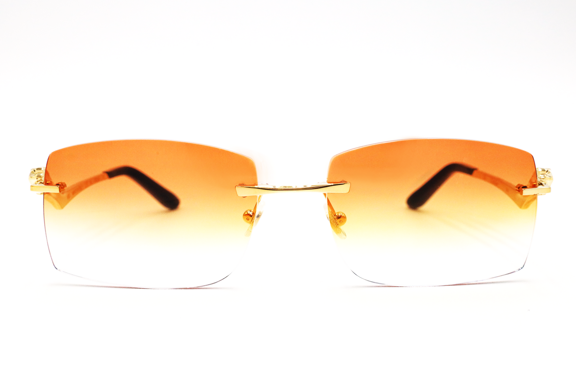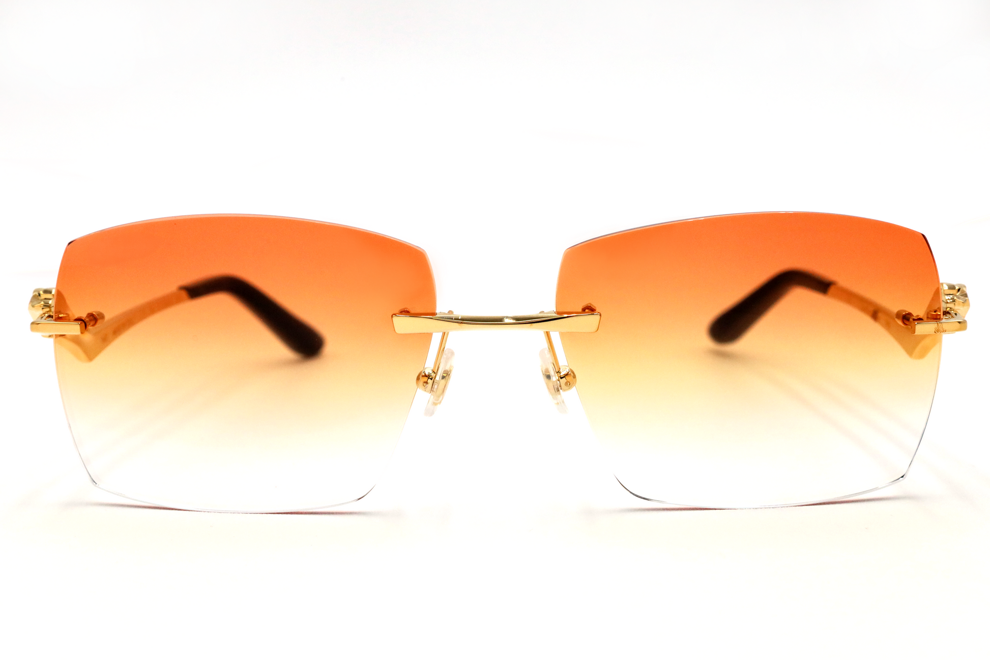 Elegant and contemporary rimless sunglasses in platinum or 24k plated gold. A pouncing Panthère leaps forward towards the hinges in an assertive display of sophistication while acetate temple tips in burgundy or black provide comfort and subtle contrast. Cartier logo engraved on temples and Double C Décor signature on the adjustable nose pads.