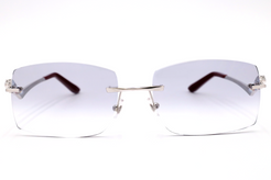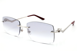 Elegant and contemporary rimless sunglasses in platinum or 24k plated gold. A pouncing Panthère leaps forward towards the hinges in an assertive display of sophistication while acetate temple tips in burgundy or black provide comfort and subtle contrast. Cartier logo engraved on temples and Double C Décor signature on the adjustable nose pads.