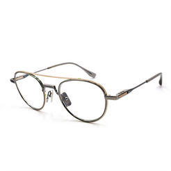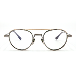 A continuous one-piece titanium frame and brow bar design filled with subtle contrast and contouring. The multi-piece titanium temples are embellished with linework detailing that transition gracefully into Japanese acetate temple tips. Deceptively simple, wondrously complex.