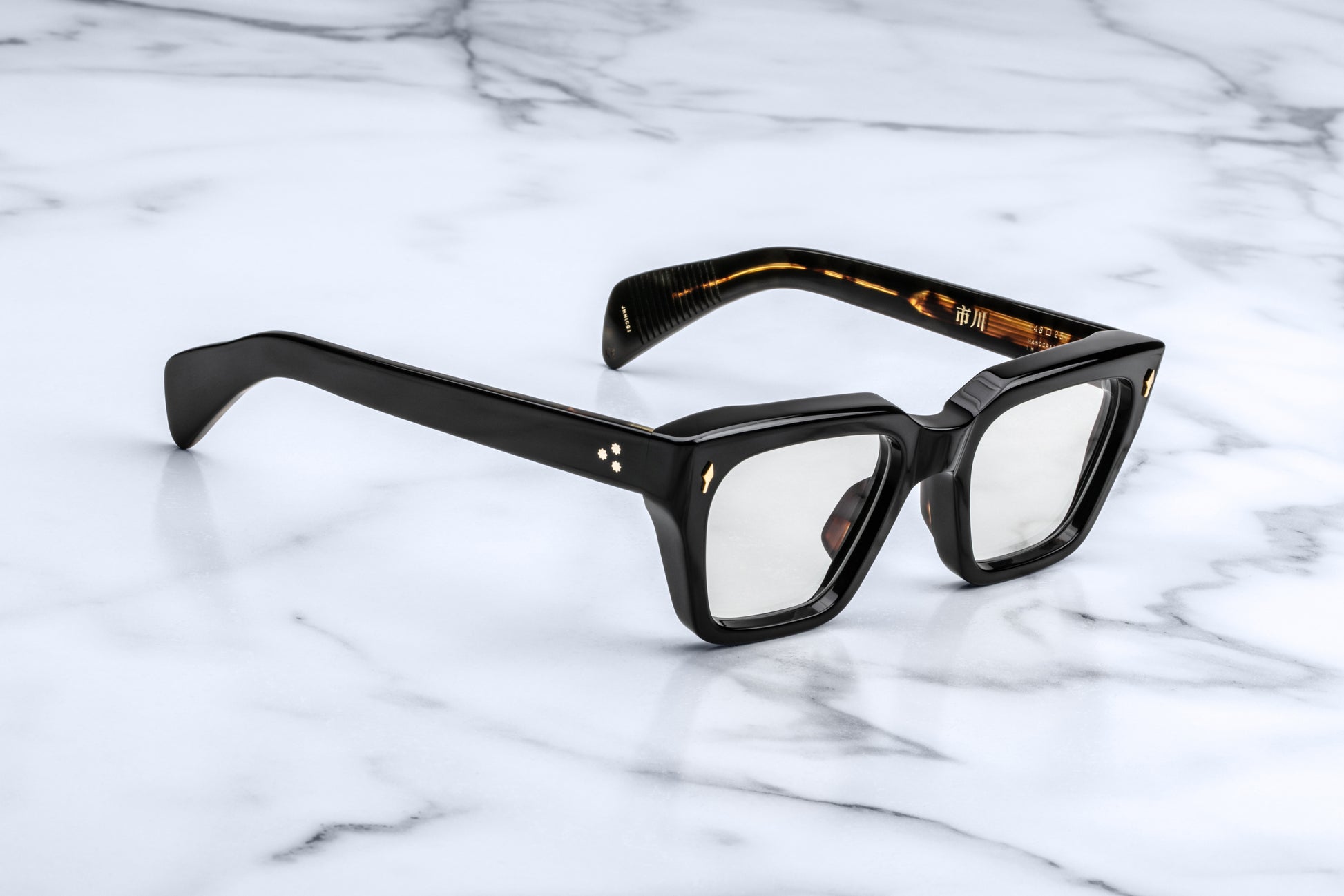 Inspired by the spectacles worn by famed Japanese director Kon Ichikawa, these frames feel distinctly modern with their bold form and clean lines. Striking, with thicker acetate towards the temples of the frames, creating a slightly winged look. The signature front arrowhead pins adorn the slight wings, imbuing a sense of drama in combination with the exposed silver wirecore.