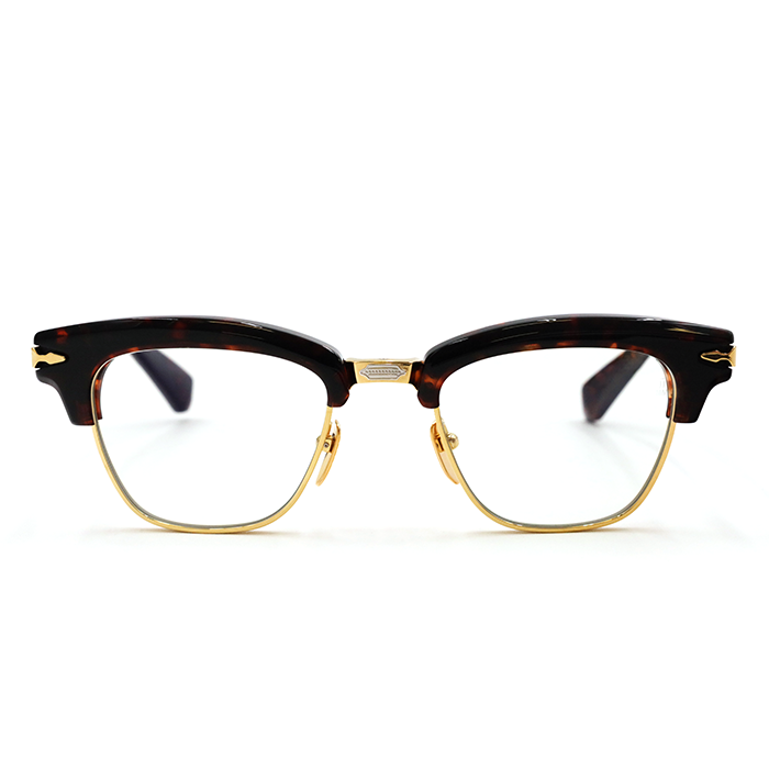 A reimagination of a beloved style originally released in 2019, these sophisticated spectacles are brimming with 50s inspiration and detailing. Golden titanium is complemented by an acetate architectural brow and matching temple tips. The striking bridge shines with dual-toned decorations and a striking, unique take on JMM's classic arrowhead decorates the front and hinges.