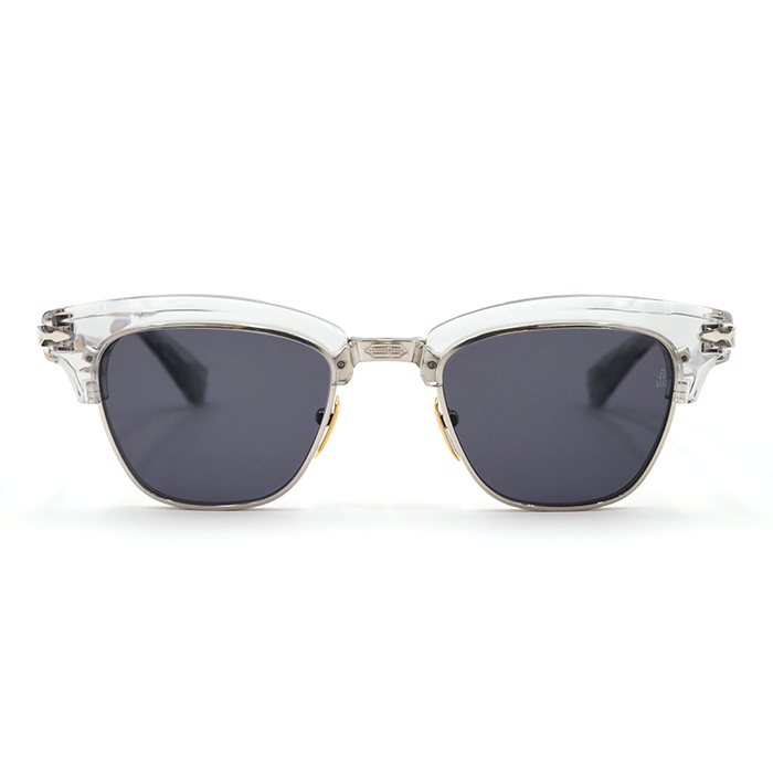 A reimagination of a beloved style originally released in 2019, these sophisticated spectacles are brimming with 50s inspiration and detailing. Gleaming titanium is complemented by an acetate architectural brow and matching temple tips. The striking bridge shines with dual-finely engraved decorations and a striking, unique take on JMM's classic arrowhead decorates the front and hinges.